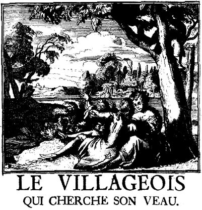 Un villageois cherche son veau. Il monte sur un arbre et deux amants viennent s'étendre dessous. | Un villageois ayant perdu son veau, L'alla chercher dans la forêt prochaine Il se plaça sur l'arbre le plus beau, Pour mieux entendre, et pour voir dans la plaine. Vient une dame avec un jouvenceau Le lieu leur plaît, l'eau leur vient à la bouche Et le galant, qui sur l'herbe la couche, Crie en voyant je ne sais quels appas: O dieux, que vois-je, et que ne vois-je pas ! Sans dire quoi; car c'étaient lettres closes. Lors le manant les arrêtant tout coi. "Homme de bien, qui voyez tant de choses, Voyez-vous point mon veau ? dites-le moi." |